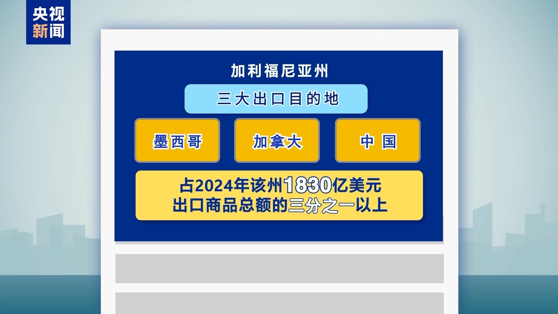 加州是美国人口和经济规模第一大州,也是美国最大的商品进口州。根据加州州长办公室发布的数据,该州2023年国内生产总值为3.9万亿美元,2024年进出口贸易总额接近6750亿美元。墨西哥、加拿大和中国是加州三大出口目的地,占2024年该州1830亿美元出口商品总额的三分之一以上。